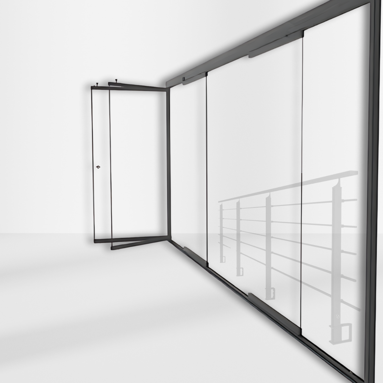 Panele szklane łatwo przesuwają się po niskiej prowadnicy i składają się na bok.